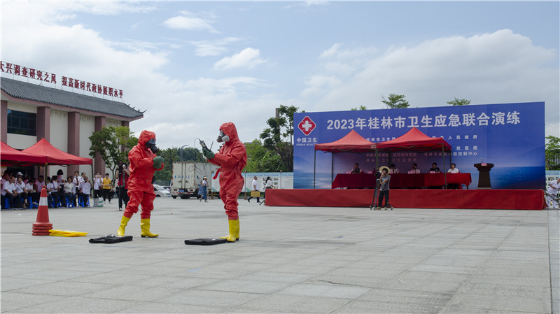 桂林市卫生监督应急队与桂林市突发中毒事件应急处置队共同进行“氯气中毒事故卫生应急处置演练”。